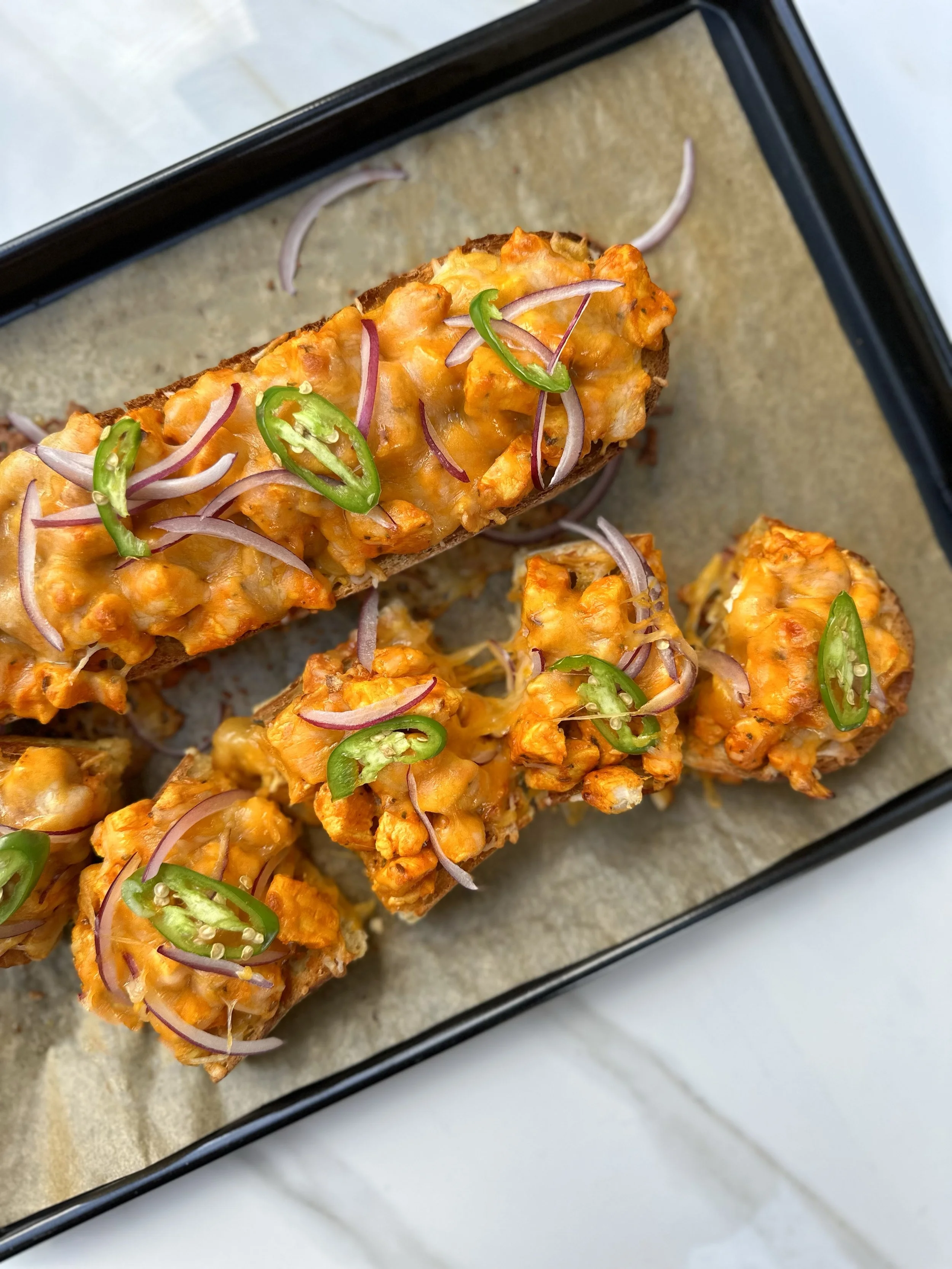 Once the bread is toasted, top generously with the butter chicken and shredded cheese.