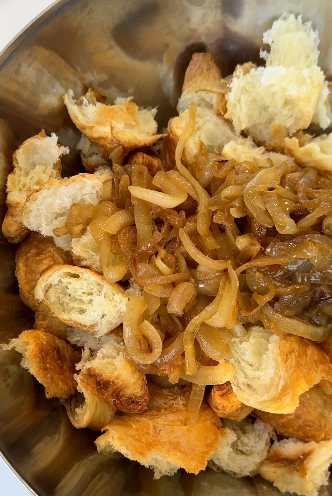 - Mix everything together gently, so as not to break up the croissants too much. Taste for seasoning and add more salt and pepper per your preference.