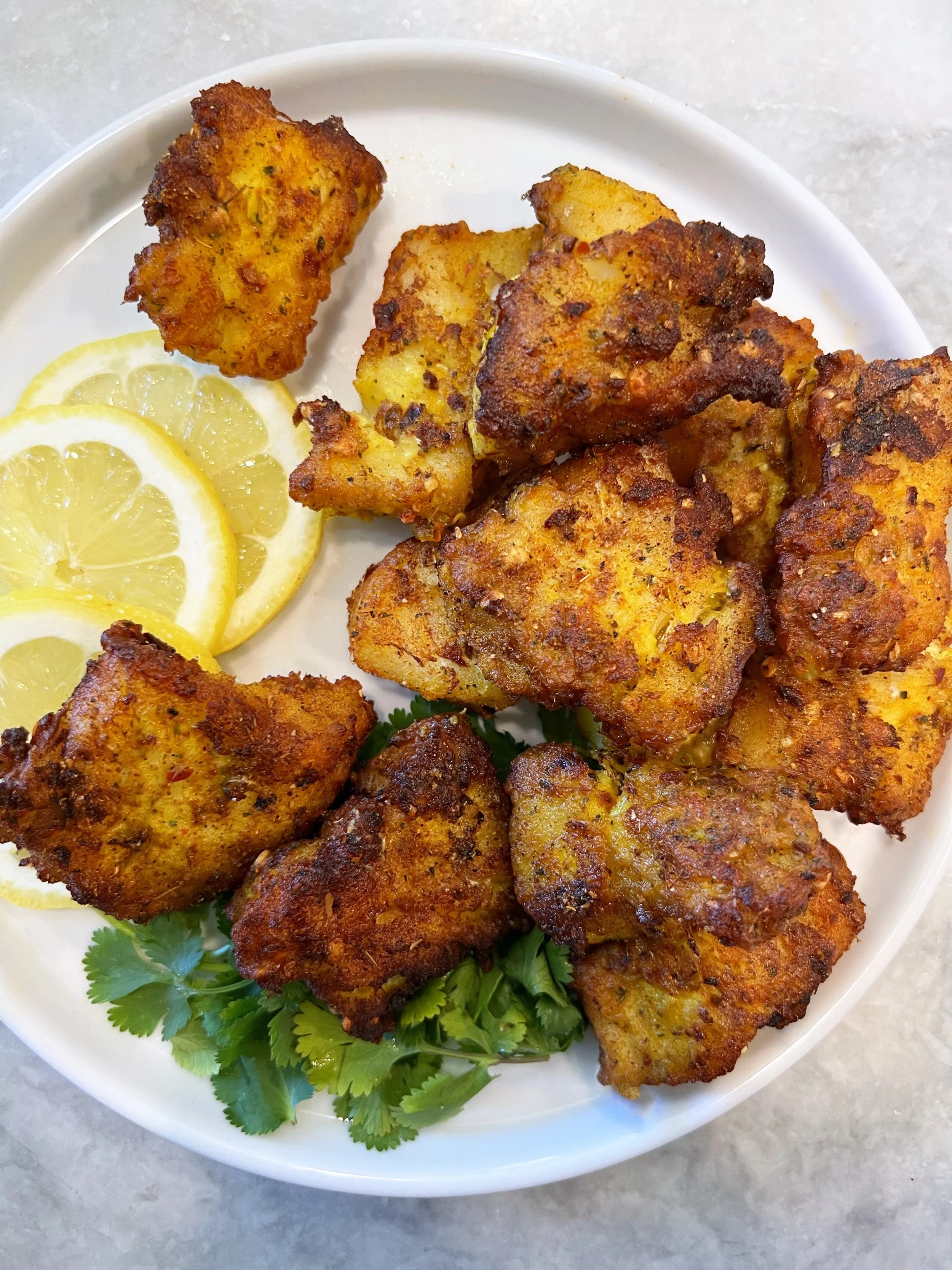 Immediately after removing from the pan, sprinkle the fish with a little salt and chaat masala.